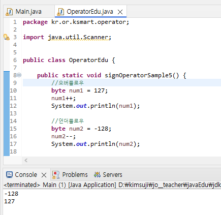 byte타입일 경우 최대값 127에서 1을 더하면 128이 되어 오버플로가 발생하여 연산 결과는 최소값인 -128이 된다. 그리고 나서 다시 1을 더하면 -127이 된다.