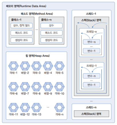 ② 힙 영역 : 객체가 생성되는 영역. 객체의 번지는 메서드 영역과 스택 영역의 상수와 변수에서 참조