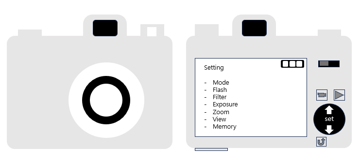 - 기능 : 사진 촬영, 동영상 촬영, 촬영 모드 선택(자동, 수동 등), 사진 확인&삭제, 플래시 설정, 노출 설정(셔터속도, 조리개), 전원on/off, 화면 확대/축소, 필터설정, 메모리 카드 관리